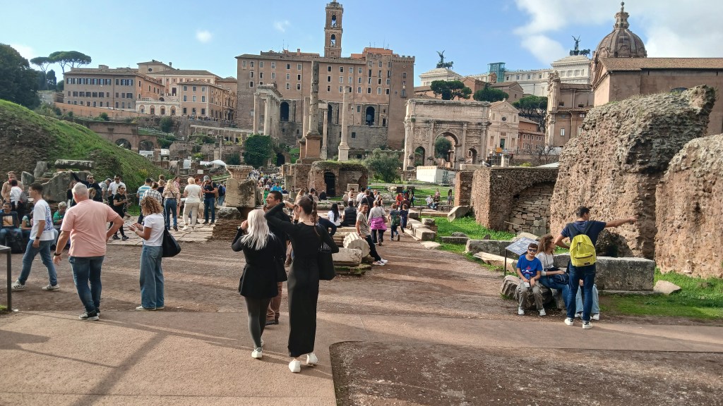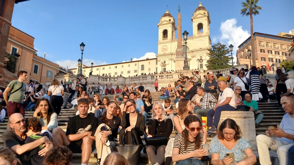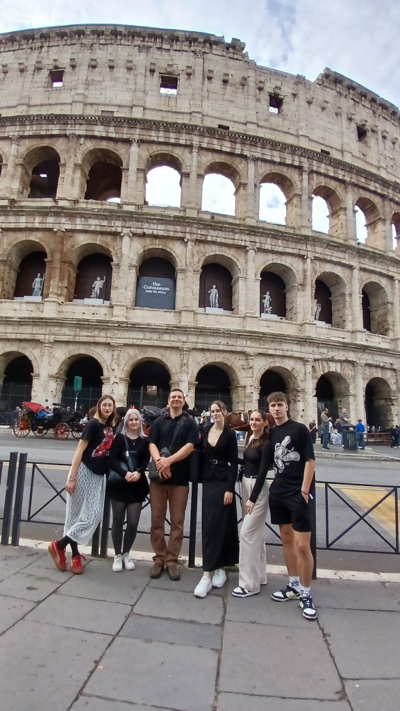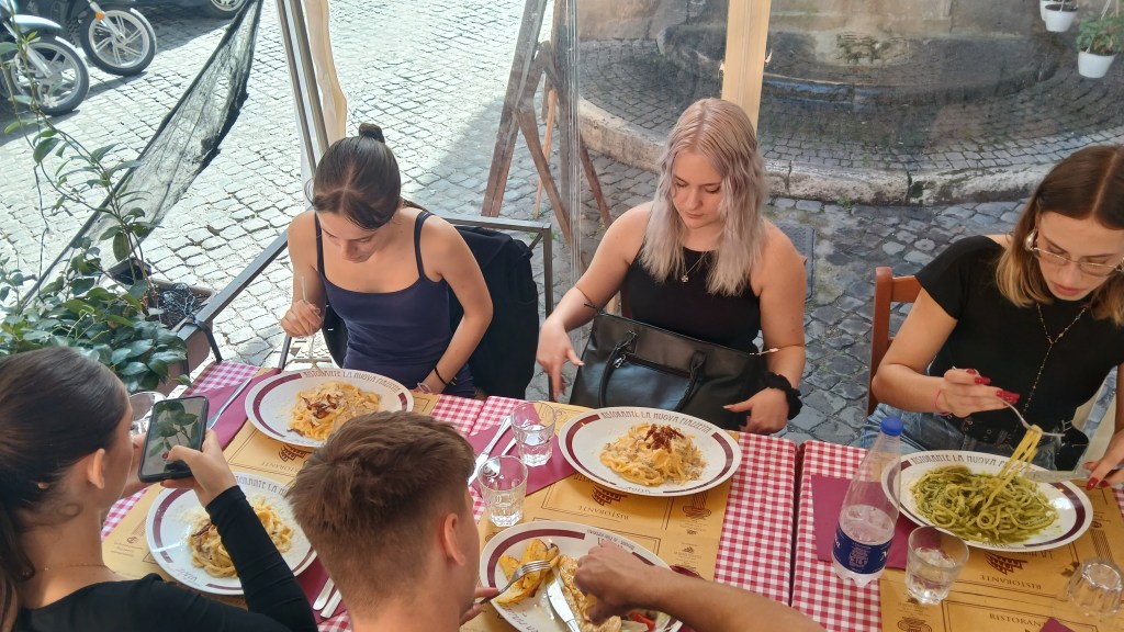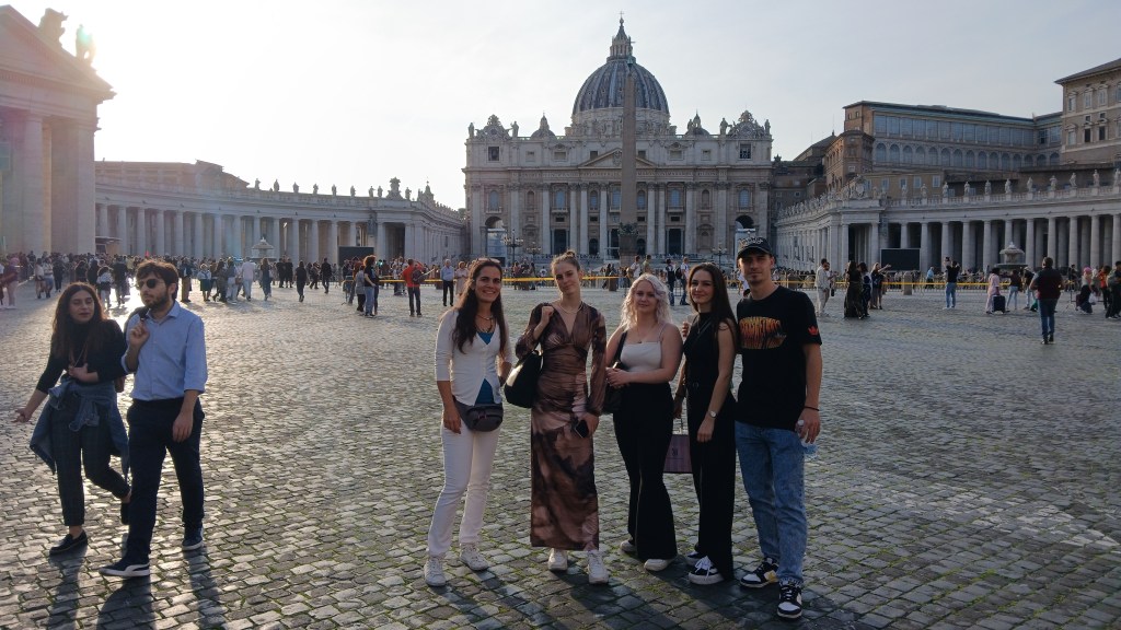 Persze így is rengeteg mindent láttunk és tapasztaltunk! Felsorolni is nehéz lenne, de többek között megnéztük a Colosseumot, a mellette lévő Forum Romanum-ot és a Palatinus Hill dombján sétáltunk; láttuk a Trevi-kutat, a Piazza Venezia monumentális emlékművét, a Haza Oltárát; ültünk a Spanyol lépcsőn és reneszánsz és barokk remekműveket csodáltunk a Palazzo Barberini múzeumban; megnéztük a Pantheont, a Vatikán Múzeum lenyűgöző kiállításait, a Szent Péter Bazilikát és a Tevere folyó partján álló Angyalvárat… minden nap megtettünk 5-10 km sétát és holt fáradtan tértünk vissza a szállásunkra 😃