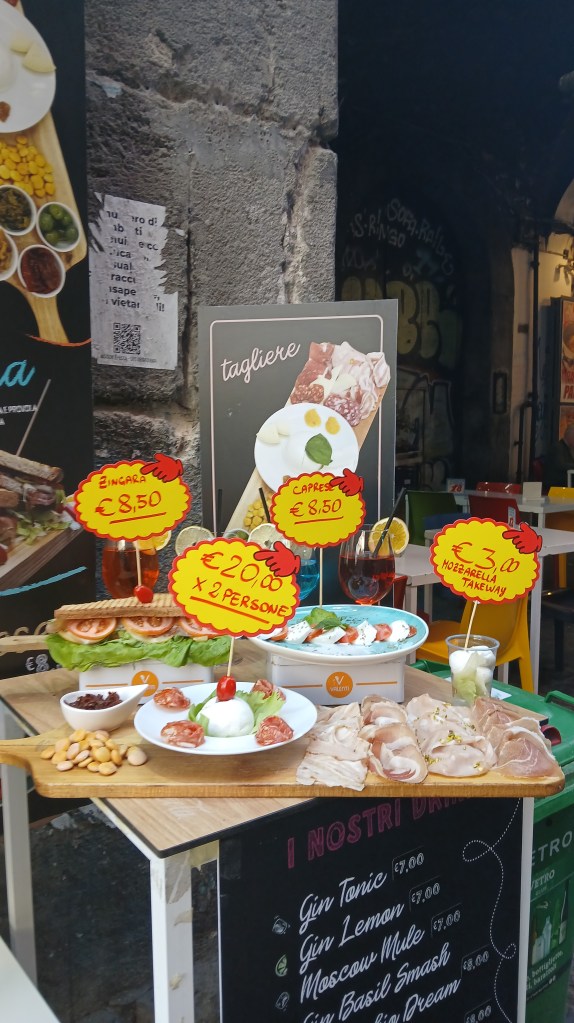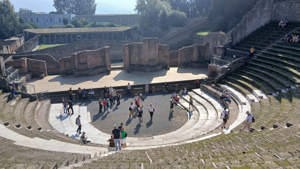Rómából vonattal Nápoly felé vettük az irányt, és az utazási napok hátralévő részében ezt a vidéket fedeztük fel. Olaszországnak ez a része egy újabb világot tárt fel előttünk: Pompeihez közel, egy kisvárosban szálltunk meg és kicsit olyan volt, mintha visszacsöppentünk volna a múltba a fejlettség szempontjából. Elég vegyes volt a kép, mert a körülvevő természeti értékek csodaszépek voltak, körülöttünk hegyek, a Vezúv és a tenger is a közelben volt. Azonban a házak és utcák nagyjából fele-fele arányban voltak jól karbantartottak, a zsúfoltság itt is jelen volt, és sajnos sok helyen koszosak, szemetesek voltak a területek. A rengeteg autó és motoros miatt a kisvárosban folyamatosan hangos volt az alapzaj, és a levegő tisztasága is hagyott kívánnivalót maga után…